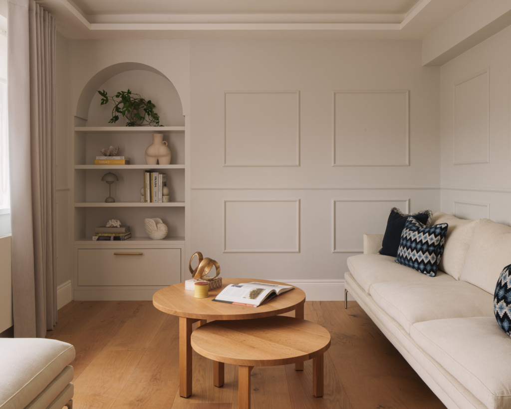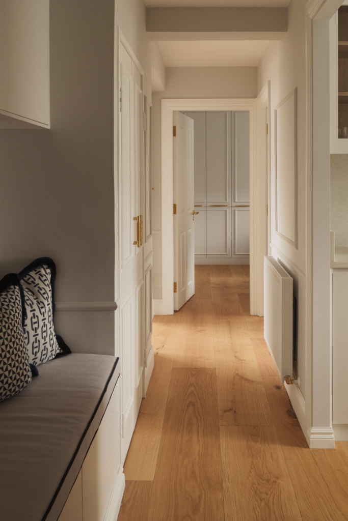Sleek oak flooring now runs seamlessly throughout the apartment, its soft grain and warm tone grounding the interiors while keeping the aesthetic clean and contemporary. Architectural lines were simplified to bring order and refinement, creating a layout that feels intentional, open, and effortlessly organised.
