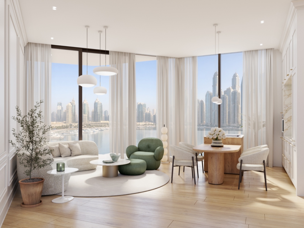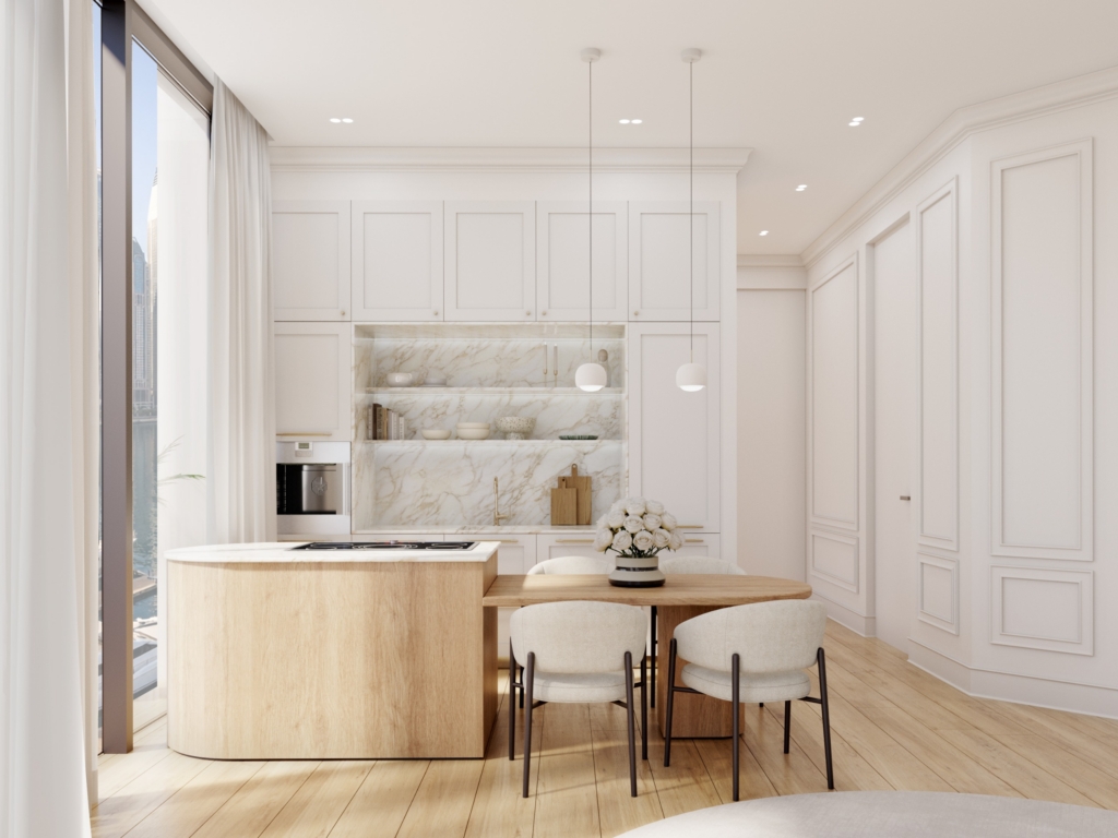 The colour scheme draws from the apartment’s surroundings: a natural, understated palette layered with gentle neutrals, elevated by subtle touches of blue that echo the expansive sky visible from the balcony. This connection between interior and exterior creates a serene continuity — a home that feels harmonised with the light and views it receives each day.